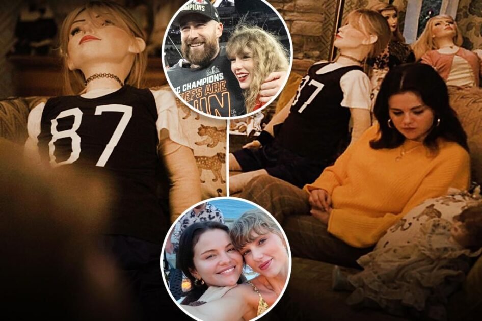 The life-size figure to Gomez’s right resembled Swift with blond locks, a red lip and a jersey featuring Kelce’s number, 87.